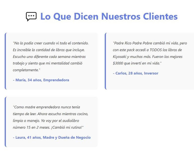 "No lo podía creer cuando vi todo el contenido. Es increíble la cantidad de libros que incluye. Escucho uno diferente cada semana mientras trabajo y siento que mi mentalidad cambió completamente."