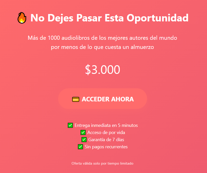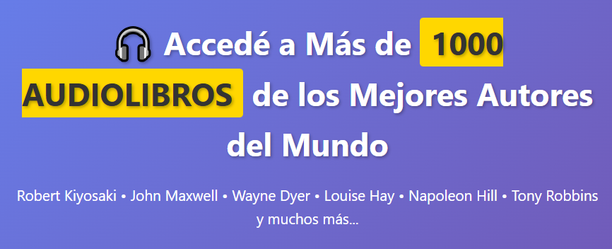 Imaginate tener acceso INMEDIATO a más de 1000 audiolibros de los autores más exitosos del mundo por solo $3000. No más excusas de "no tengo tiempo para leer": los escuchás mientras manejás, cocinás o entrenás. Robert Kiyosaki, Louise Hay, Wayne Dyer y 997 audiolibros más en tu Google Drive, para siempre.